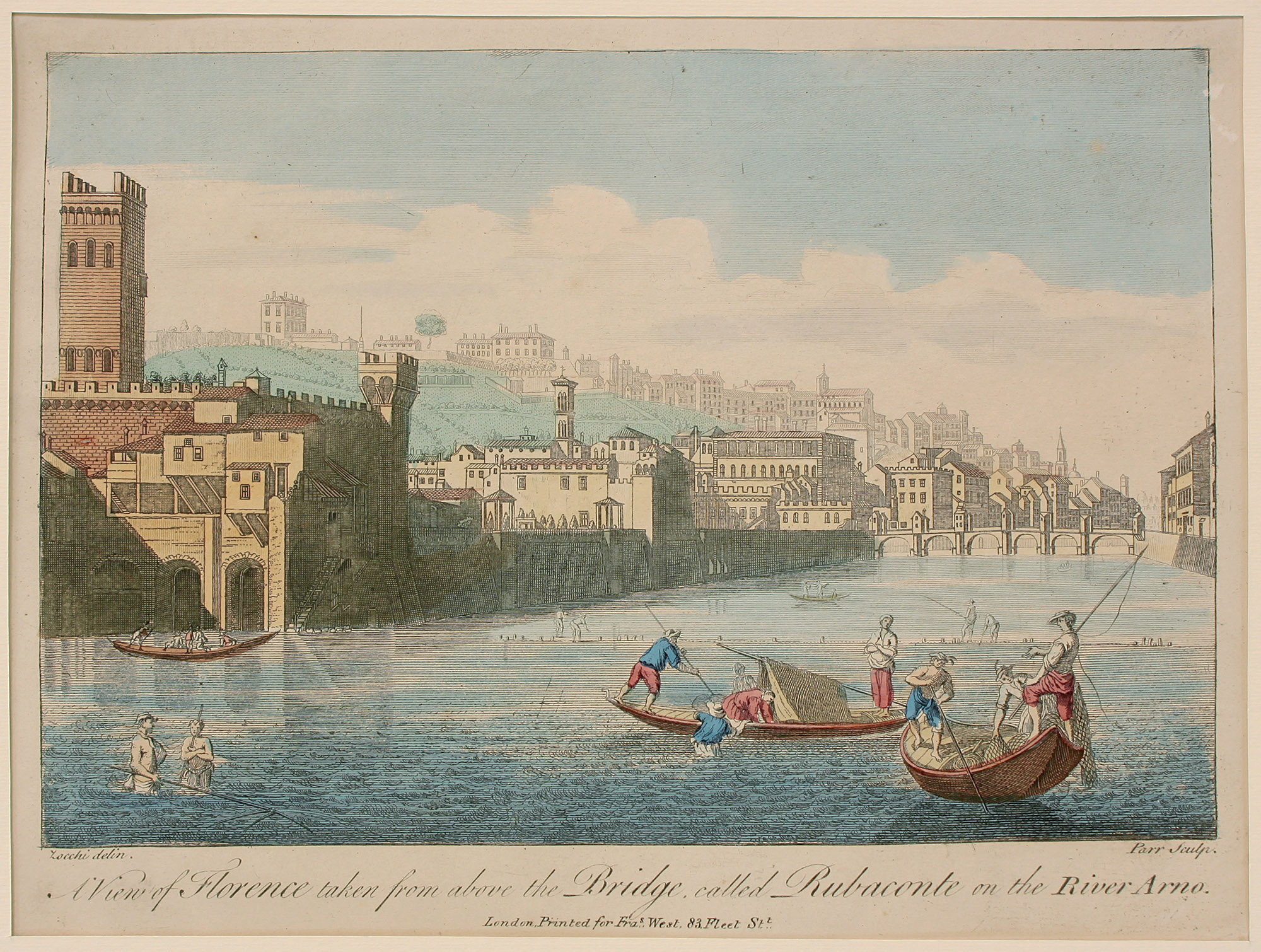 L’incisione del Parr, con dimensioni assai ridotte rispetto all’originale, è tratta dalla terza tavola della raccolta dello Zocchi, dal titolo Veduta di una parte di Firenze presa di fuori della Porta alla Croce presso al fiume Arno, incisa da Carlo Gregori. La scena ci mostra delle figure intente a pescare, in barca o parzialmente immerse nel fiume, non all’altezza del Ponte alle Grazie, allora Rubaconte, come indicato nel titolo inglese ma all’altezza della Torre della Zecca, quasi di fronte alla Torre di San Niccolò, con un punto di vista così basso che denuncia una ripresa dalla pescaia, al livello dell’acqua. L’inquadratura, aprendosi a ventaglio in fuga prospettica, ci mostra in fondo il Ponte alle Grazie con le caratteristiche casette abbattute nel 1876 e, sulla sinistra, le Mulina di San Niccolò, anch’esse scomparse in seguito alla realizzazione del lungarno, e il Palazzo Serristori.