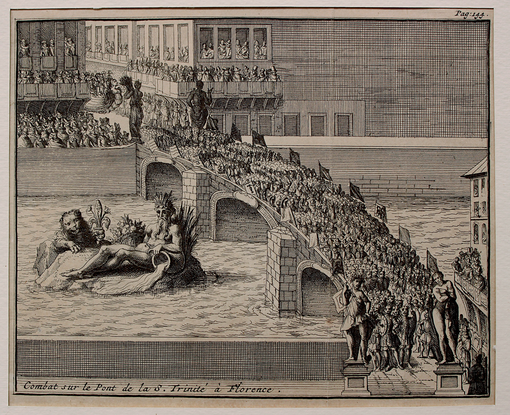 Questa incisione, tratta dalla guida turistica dell’Italia pubblicata da De Rogissart e Havard nel 1706, Les délices d’Italie, e riedita appena un anno dopo in quattro volumi, raffigura un combattimento sul Ponte di Santa Trinita. L’incisione è un’interessante testimonianza del modus operandi degli scrittori ed editori del passato, non vincolati ad alcun concetto di diritto di riproduzione. La scena è ambientata, a giudicare dagli abiti dei personaggi che l’affollano, a inizio Seicento, un secolo prima della pubblicazione del volume da cui è tratta. Il combattimento è con ogni evidenza di parata: il corteo dei soldati affiancato da stendardi passa tra due fila di spettatori che stanno in piedi ai bordi della strada, mentre altri spettatori più fortunati possono ammirare lo spettacolo dall’alto di speciali palchi montati per l’occasione. Completa la scena l’allegoria del fiume Arno con accanto il leone Marzocco. La stampa ci mostra il ponte nella sua “versione definitiva”, cioè con alle estremità le quattro statue raffiguranti le stagioni, inaugurate nel 1608, in occasione delle nozze del futuro granduca Cosimo II dei Medici con Maria Maddalena d’Austria e distrutte dalle bombe della seconda guerra mondiale. E sono proprio i festeggiamenti fatti in occasione delle nozze che l’incisione in effetti raffigura, essendo tratta dal volume di Camillo Rinuccini Descrizione delle feste fatte nelle reali nozze de’ Serenissimi principi di Toscana d. Cosimo de’ Medici, e Maria Maddalena arcidvchessa d’Avstria, pubblicato a Firenze nello stesso anno 1608.