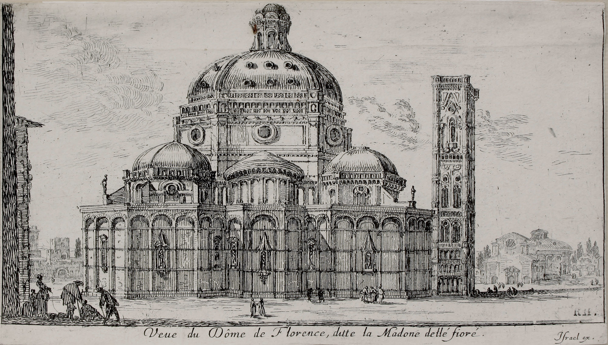 L’incisione, che presenta una scelta di punto di vista assolutamente peculiare per l’epoca, raffigura l’abside della Cattedrale fiorentina con lo spiazzo antistante, nel quale si muovono diversi gruppi di figure in conversazione o intente in altre attività: una madre passeggia con la figlia mentre tiene un cane al guinzaglio, due uomini si chinano e rivolgono la parola ad un uomo seduto per terra, due figure si stringono la mano, come se si fossero riviste dopo tanto tempo. Tutti questi personaggi sono resi rapidamente con pochi tratti incisi con una tecnica nuova, quella dell’acquaforte, utilizzata in questo caso per completare e ravvivare un insieme ancora realizzato in gran parte a bulino. La differenza tra le due tecniche è notevole. L’incisione a bulino consiste in una incisione diretta della lastra di rame, tecnica che richiede un notevole sforzo e assoluta precisione. L’acquaforte è una tecnica cosiddetta indiretta, dal momento in cui l’artista non graffia direttamente il metallo ma una speciale vernice stesa su di esso. Il processo vero e proprio di incisione è svolto da un acido in cui la lastra metallica viene immersa, acido che corrode il metallo scoperto lasciando un solco la cui profondità varia a seconda del tempo di immersione. Questa tecnica, che nacque intorno alla metà del Cinquecento, permise un’ulteriore accelerazione nei tempi di esecuzione e tratti più calligrafici, più morbidi e disinvolti. I segni vivaci e rapidi adottati da Israël Silvestre rispondevano ad una precisa esigenza del suo autore, quella di riportare sulla lastra metallica degli schizzi ripresi dal vivo senza alterarne la freschezza e immediatezza. In effetti egli incise in Francia ciò che aveva disegnato in occasione dei suoi viaggi-studio in Italia.